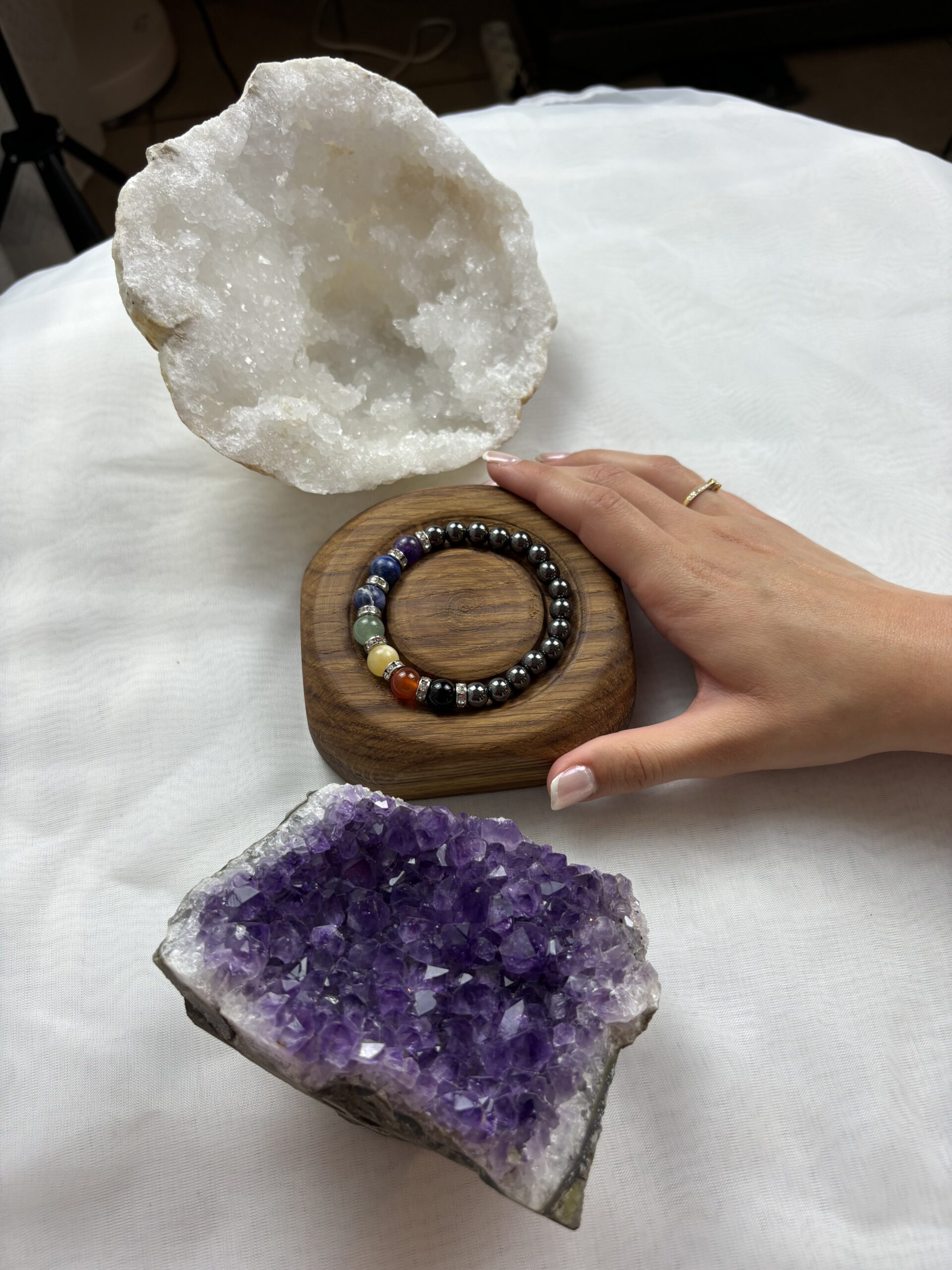 Bracelet 7 Chakras (1 perle 10 mm par Chakra: obsidienne, cornaline, citrine, aventurine, sodalite et améthyste) et hématite. Les 7 pierres permettent d’harmoniser les 7 Chakras. L’hématite est une pierre d’ancrage et de protection. Elle active et débloque le Chakra racine.