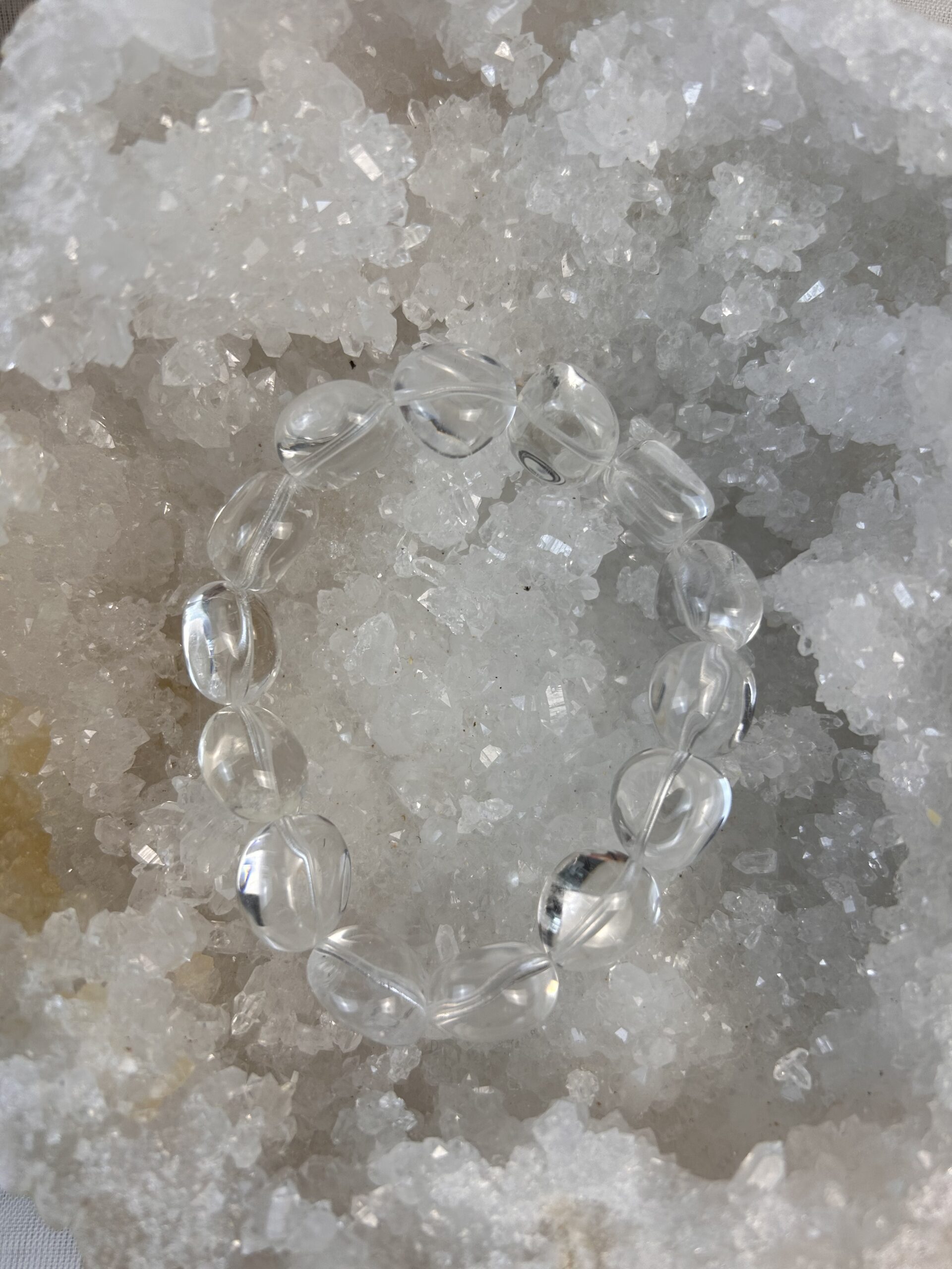Bracelet en cristal de roche. Le cristal de roche est une pierre d’amplification des formes de pensées. Il reçoit, active, emmagasine, transmet et amplifie l’énergie. Il développe les forces créatives et protège des énergies négatives.