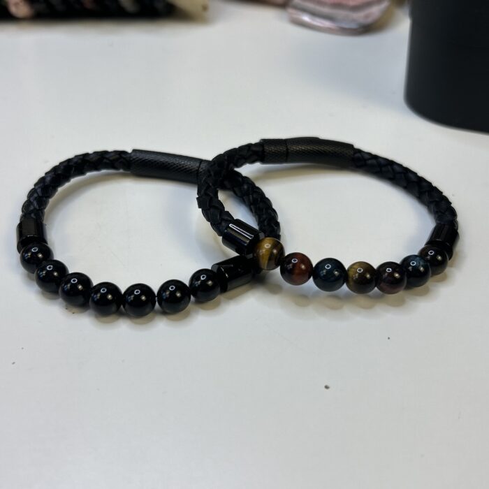 Un bracelet cuir en tourmaline noire et un bracelet cuir en œil de tigre, de taureau et de faucon.