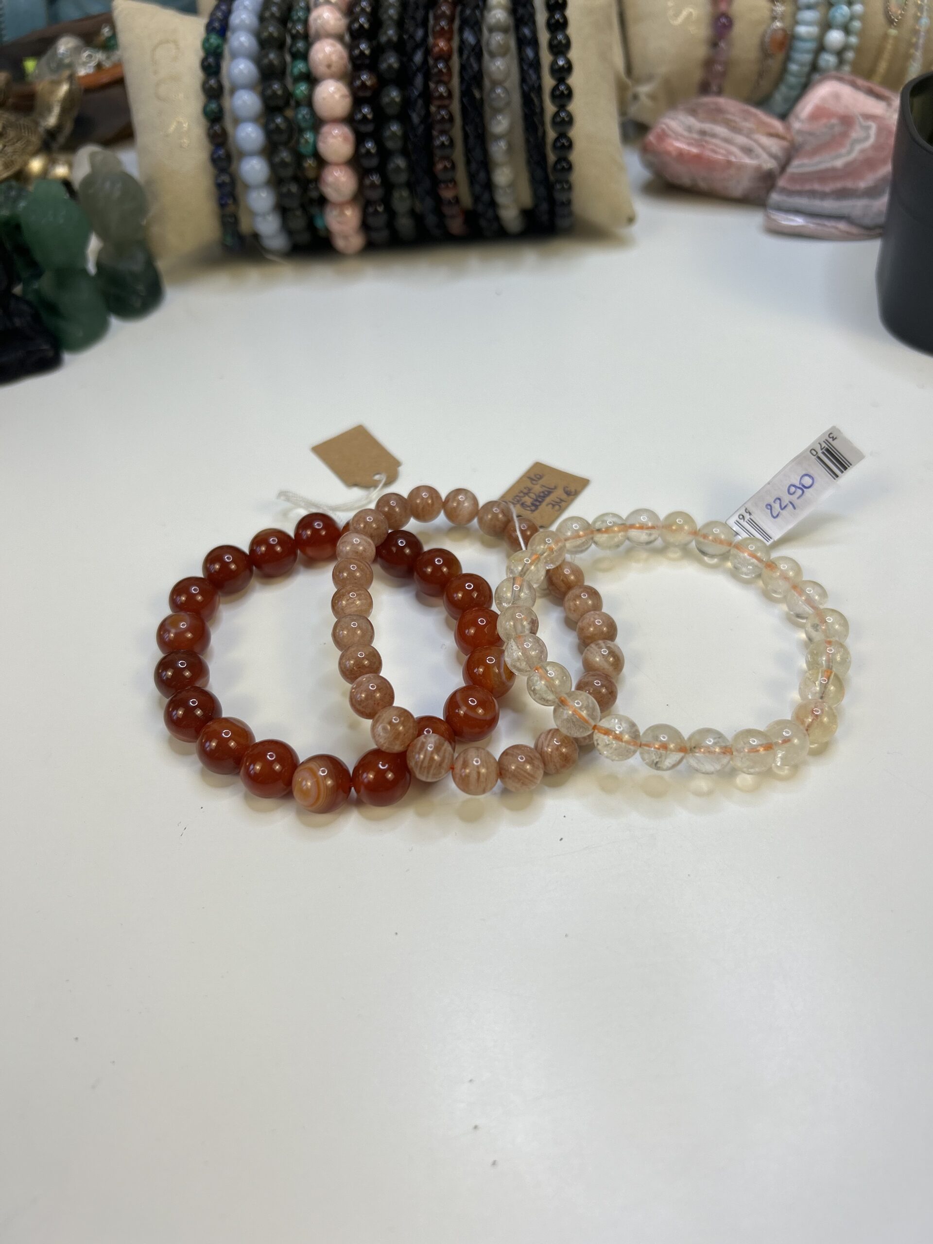 Bracelet pierre de soleil 34€, bracelet citrine 22,90€ et bracelet cornaline 14-50%=7€