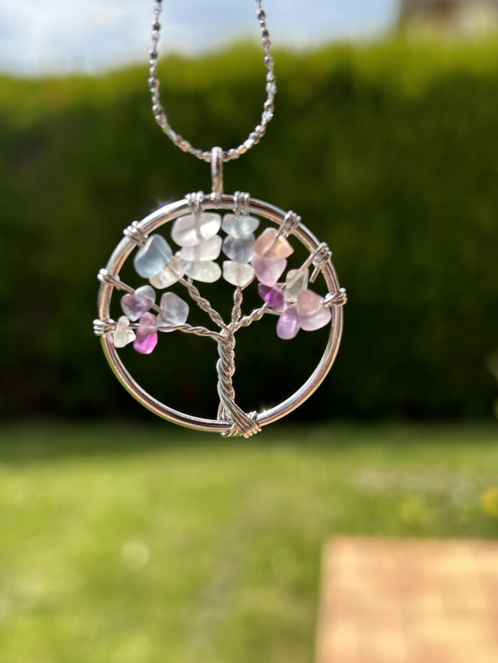 Pendentif arbre de vie en fluorite et acier inoxydable. Hauteur 3 cm. Vendu avec la chaîne en acier inoxydable.
