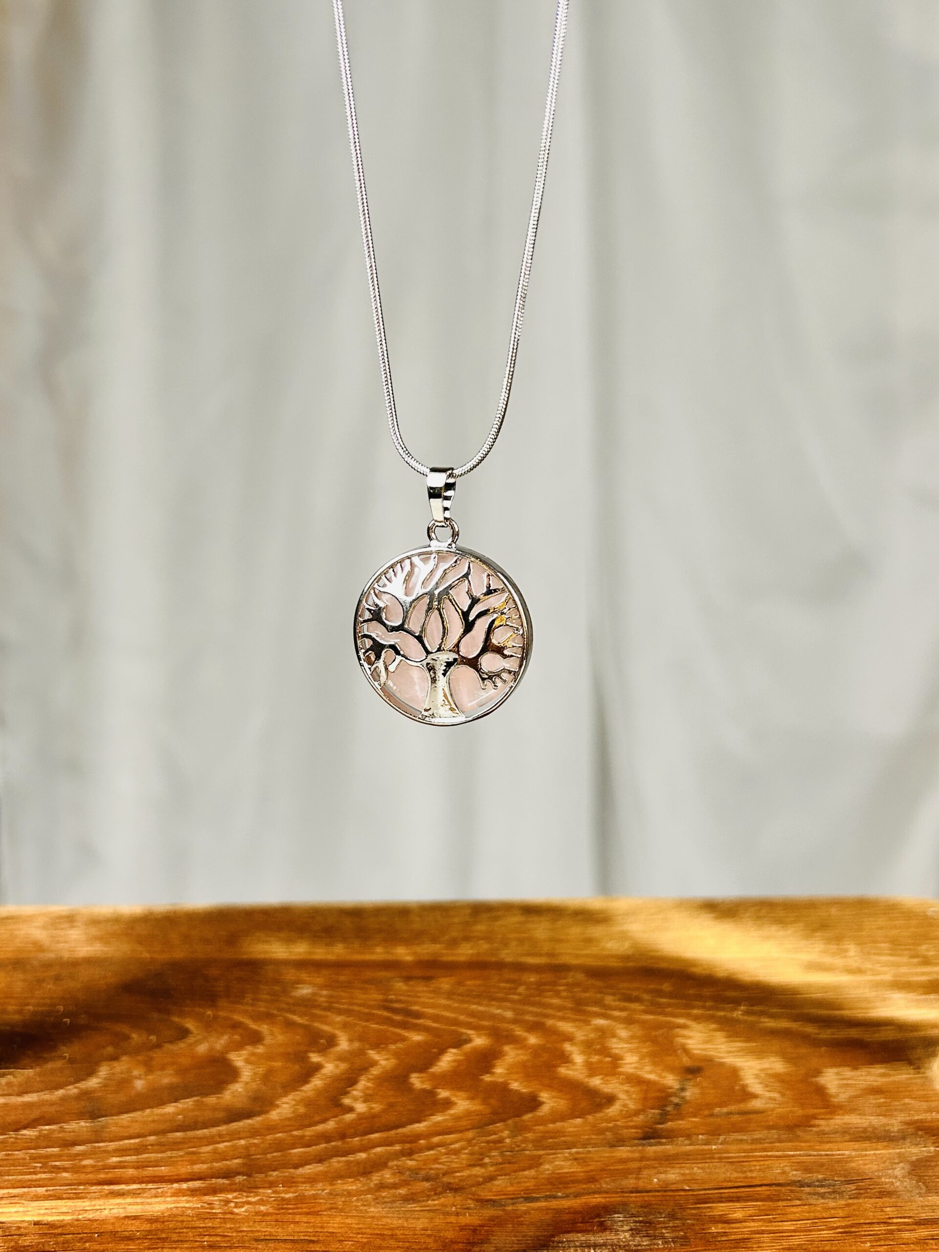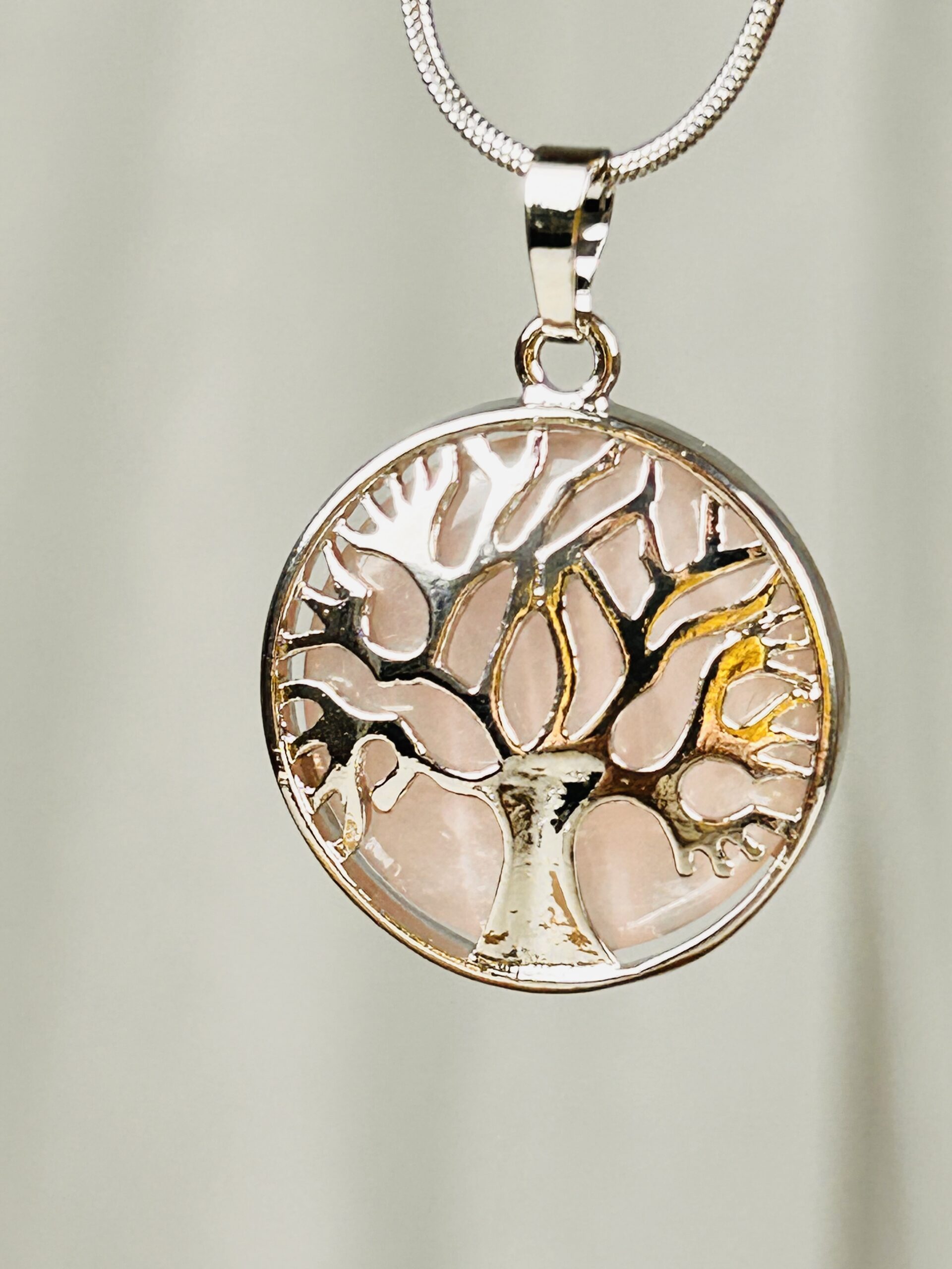 Pendentif en quartz rose et acier inoxydable. Motif arbre de vie. Hauteur 3 cm. Le quartz rose est la pierre de l’amour inconditionnel et de paix. Il apporte une profonde guérison émotionnelle, développe la compassion et le pardon. Il ouvre et active le chakra du cœur.
