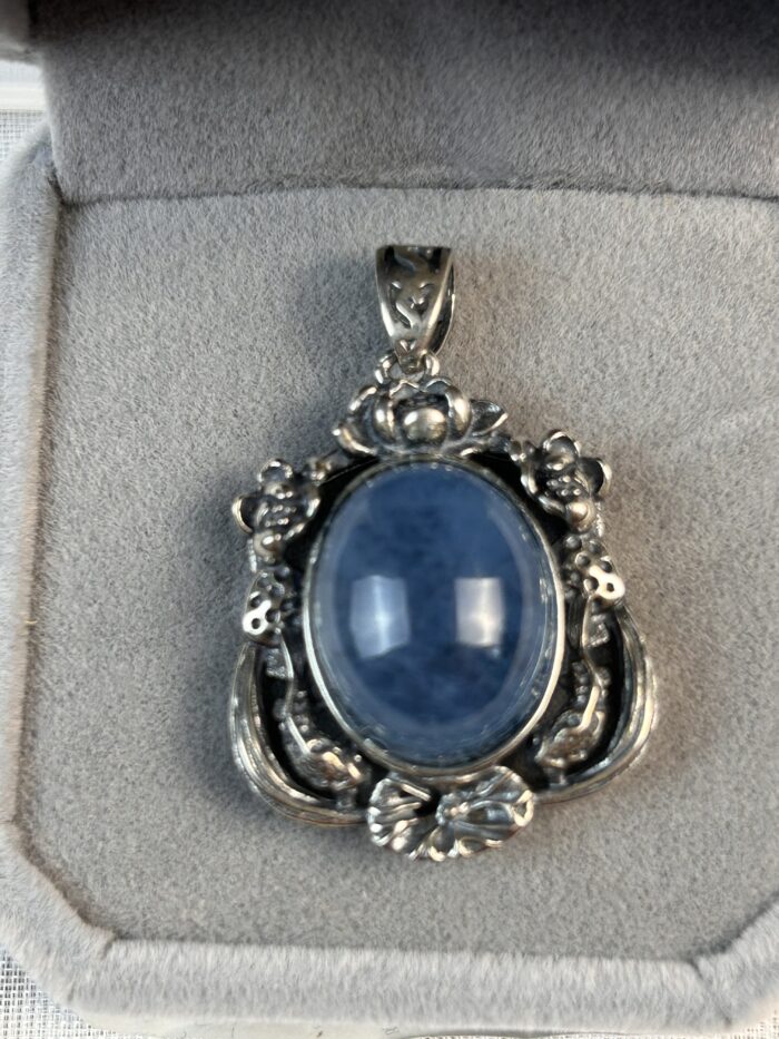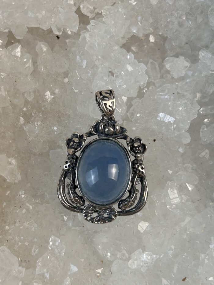 Pendentif en argent et aigue marine. Hauteur 2,5 cm. L’aigue marine est la pierre de la communication douce. Elle calme les nerfs et équilibre l’organisme.