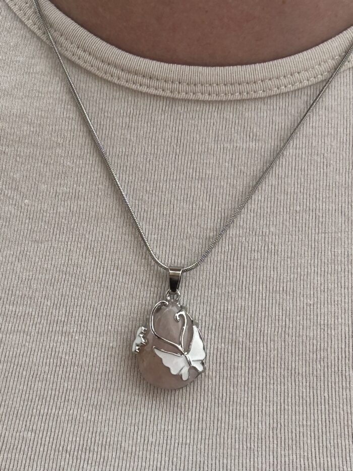 Pendentif en quartz rose et acier inoxydable. Motif papillon. Hauteur 3 cm. Le quartz rose est la pierre de l’amour inconditionnel et de paix. Il apporte une profonde guérison émotionnelle, développe la compassion et le pardon. Il ouvre et active le chakra du cœur.